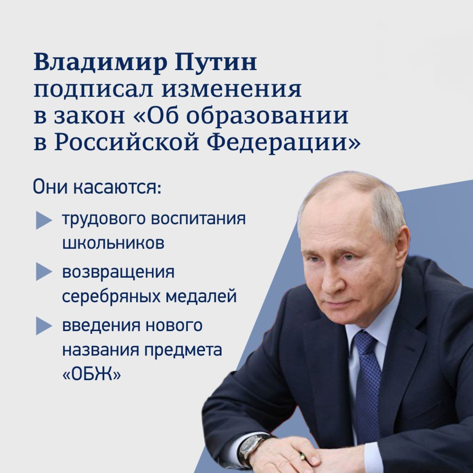 Трудовое воспитание и профориентация, возвращение серебряных медалей, изменения в учебной программе. А еще дополнение и расширение предмета ОБЖ – теперь он будет называться «Основы безопасности и защита Родины».