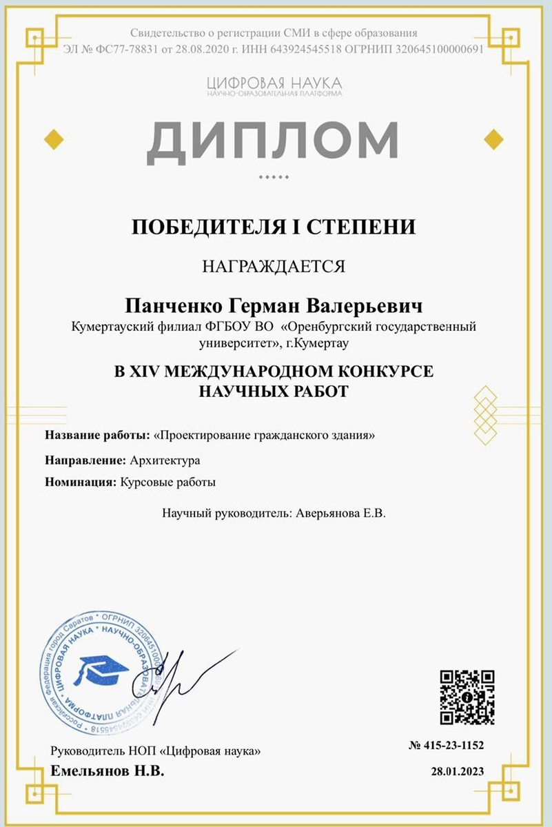 С 17 января по 31 января проходил XIV Международный конкурс научных работ, организатором которого является научно-образовательный портал «Цифровая наука». Студенты Кумертауского филиала ОГУ стали участниками конкурса, представив свои работы по трем направлениям: «Архитектура», «Философские науки», «Технические науки».