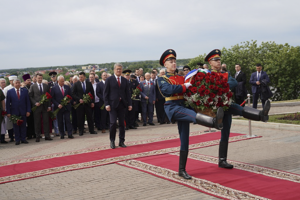 В рамках мероприятия, Радий Фаритович возложил цветы к Монументу Дружбы. От муфтията в торжественном возложении цветов к Монументу Дружбы и памятнику Салавата Юлаева принял участие Альфред хазрат Давлетшин.