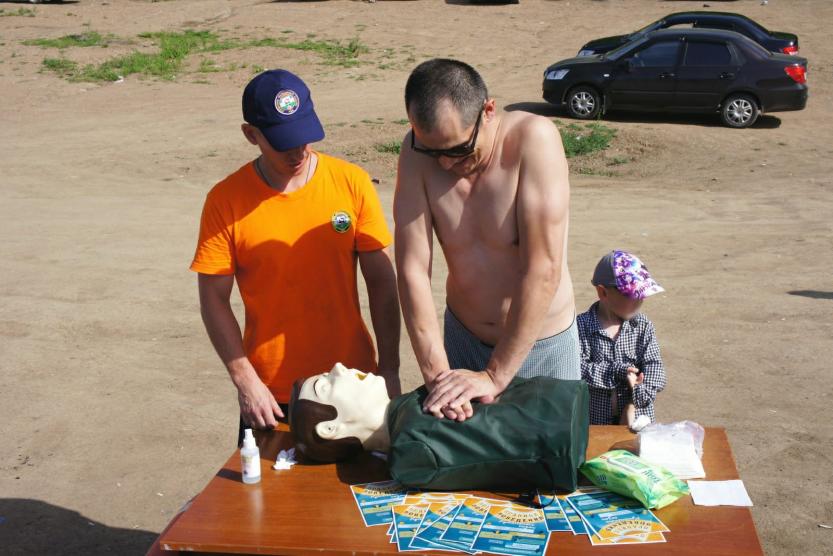 Отдыхающих здесь научили проводить сердечно-легочную реанимацию и правильно спасать тонущих. Каждый желающий мог на специальном манекене отточить полученные знания.