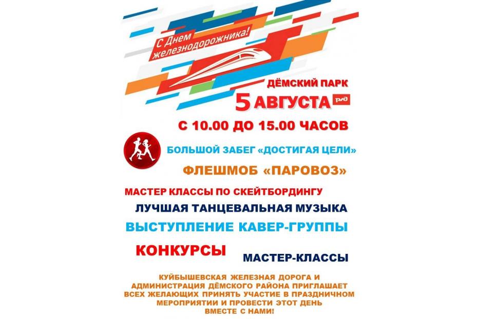 5 августа в парке Дёмского района с 10:00 до 15:00 пройдёт спортивно-музыкальный праздник для всей семьи «Достигая цели!», приуроченный ко Дню железнодорожника.