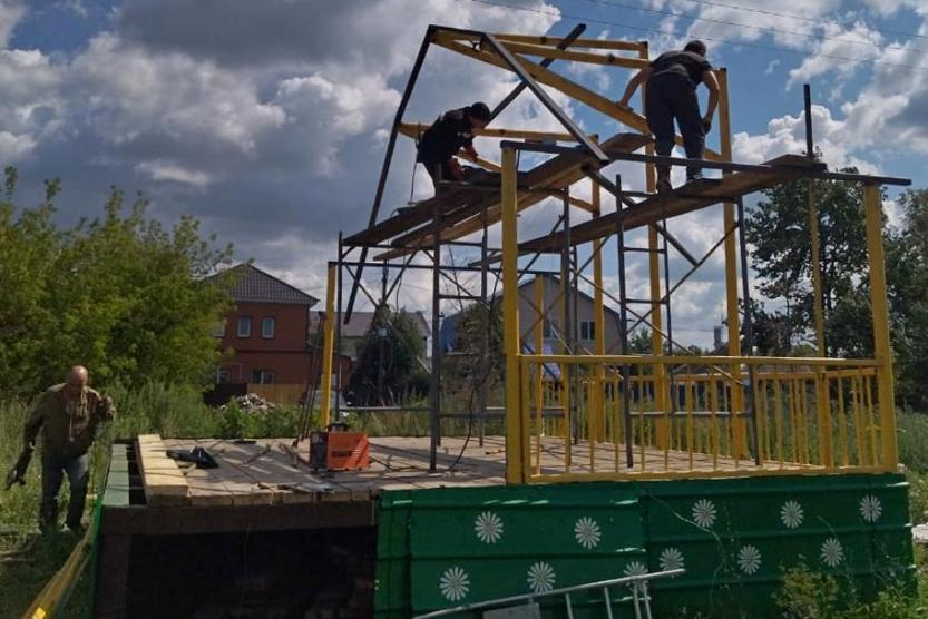 В настоящее время завершается монтаж сцены и начинаются работы по обустройству площадки, где будут установлены скамейки: сделана планировка земельного участка, завезена ПГС, песок и бордюрный камень. Все строительные работы жители проводят сами.