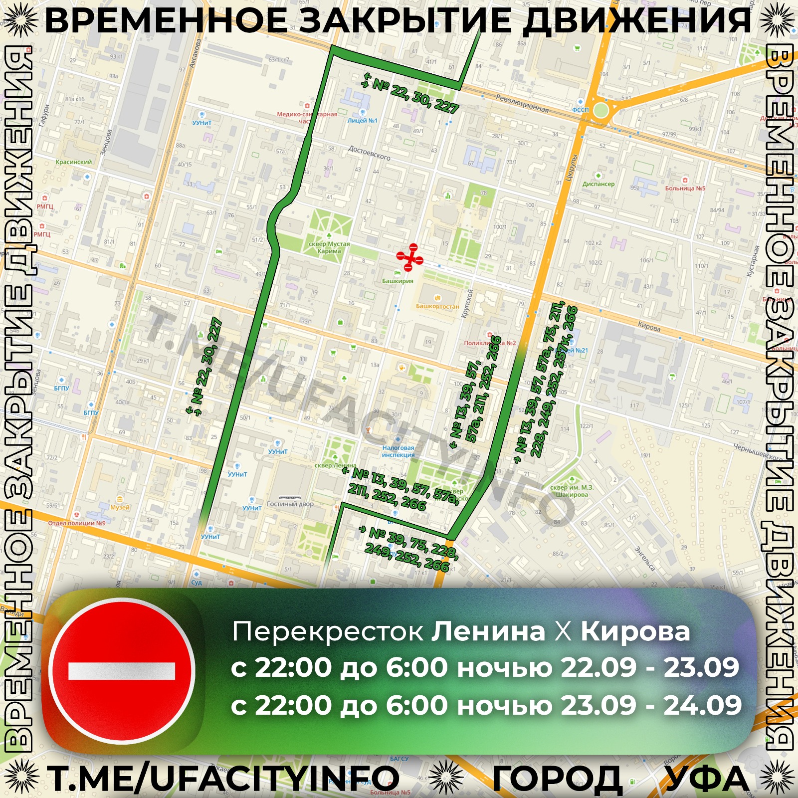 В центре Уфы в ближайшее время проведут работы по прокладке подземной кабельной канализации. В связи с этим два раза полностью будет перекрываться пересечение улиц Ленина и Кирова: с 22:00 до 06:00 - с 22 на 23 сентября и с 23 на 24 сентября.