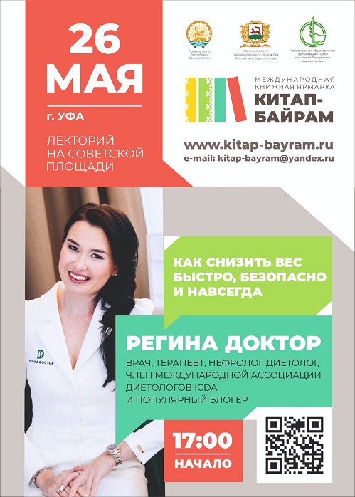 26 мая в рамках Международной книжной ярмарки «Китап-Байрам» в Уфе пройдет встреча с доктором Региной, посвященная теме «Как снизить вес быстро, безопасно, и навсегда».