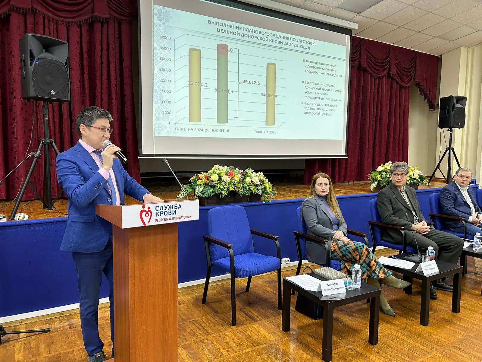 С приветственным словом перед аудиторией выступила Озерина Елена. Об итогах работы службы крови за 2025 год с докладом выступил главный врач станции переливания крови Рамиль Хамитов.
