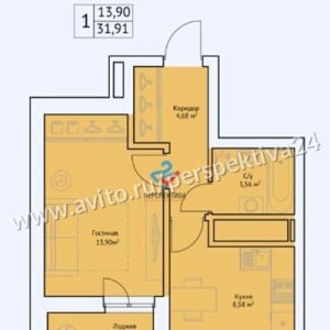 Общая площадь 31,91 кв.м. Кухня 8,58 кв.м