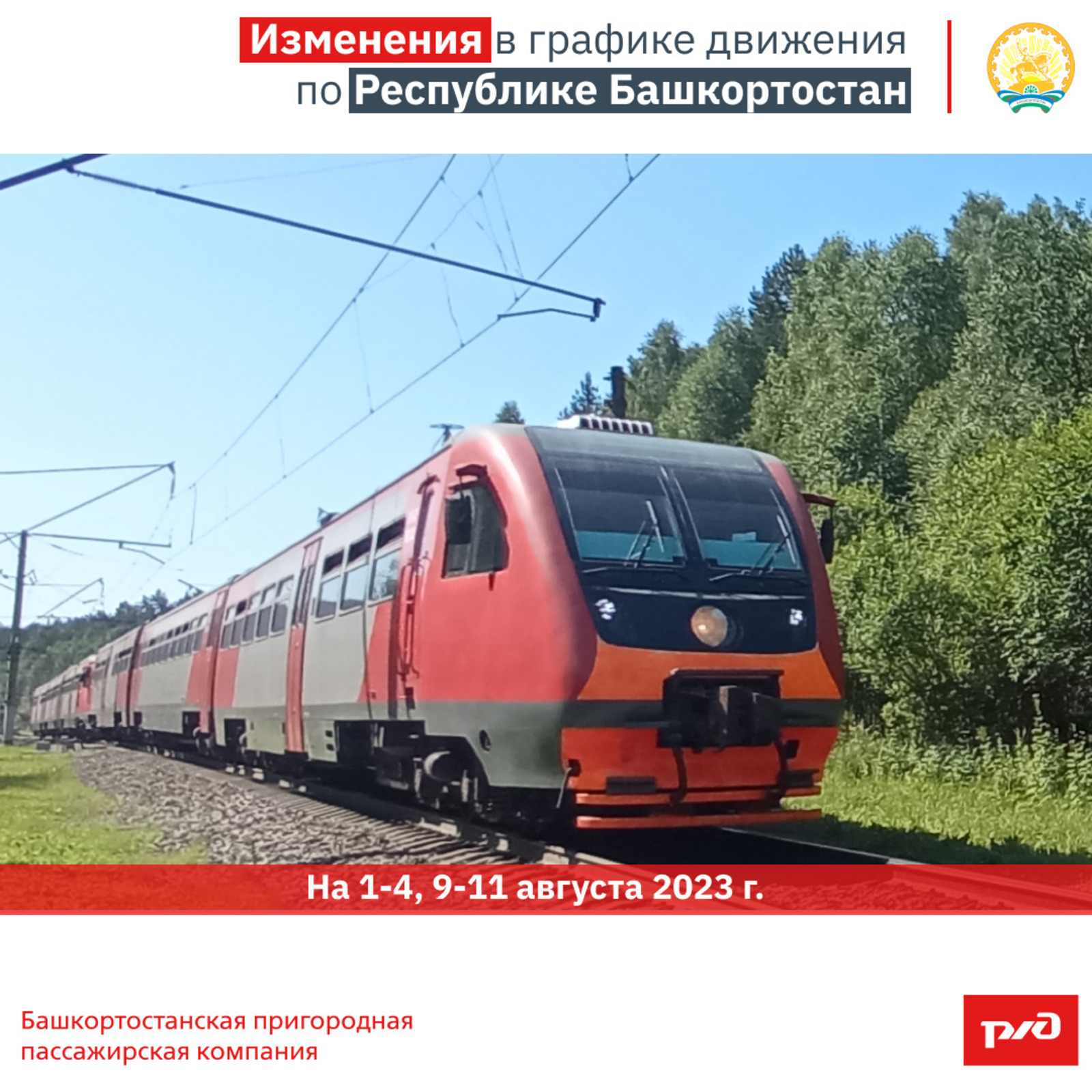 4 августа 2023 года поезд № 6415/6416 Дема – Инзер на участке Равтау – Инзер проследует на 15 мин. позже действующего расписания Дема (отпр.08.51) – Равтау (приб.10.52, отпр.11.08) – Инзер (приб.12.22).
