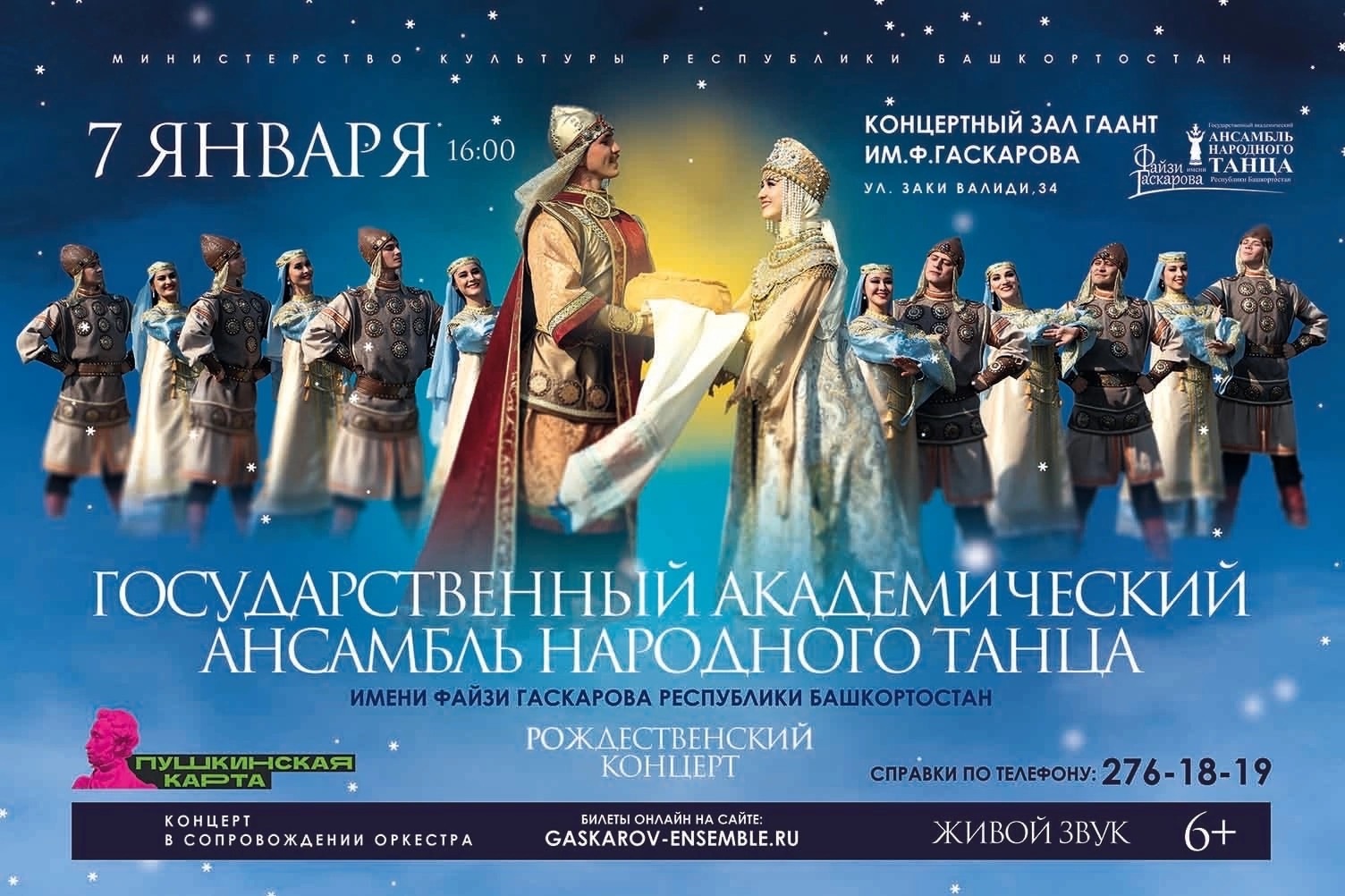 7 января в Концертном зале Государственного академического ансамбля народного танца имени Файзи Гаскарова Республики Башкортостан состоится Рождественский концерт. Коллектив представит зрителям танцы народов мира за один вечер. В программе — легендарные танцы ансамбля: «Зарифа», «Семь девушек», «Три брата». Гаскаровцы подарят публике татарский, мордовский, калмыцкий, марийский, хорезмский, китайский, аргентинский и многие другие танцы.