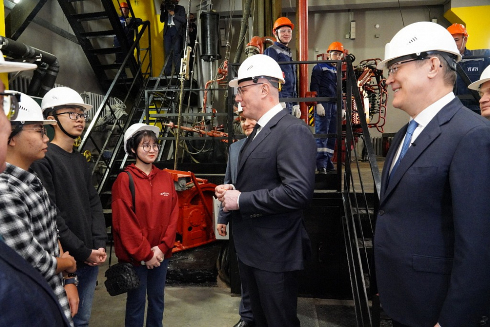 Дмитрий Чернышенко и Радий Хабиров пообщались с преподавателями и студентами, в том числе из Вьетнама, Кубы и стран Африки, которые осваивают обслуживание буровой установки и работу на вспомогательном оборудовании.